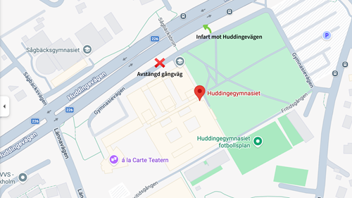 - Gående och cyklister hänvisas istället till den parallella gång- och cykelvägen längs Huddingevägen. Infart finns vid busshållplatserna på båda sidor av vägen.
